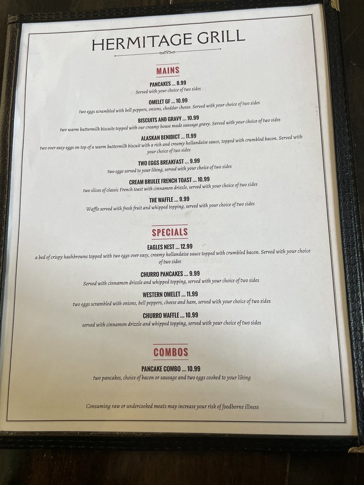 Welcome to Hermitage Grill, a charming American eatery nestled within the scenic Alaskan Inn along the tranquil waters of Ogden Canyon. This hidden gem offers a delightful breakfast and lunch menu, showcasing hearty favorites like Biscuits and Gravy and the indulgent Cream Brulee French Toast, all affordably priced under $12.99.